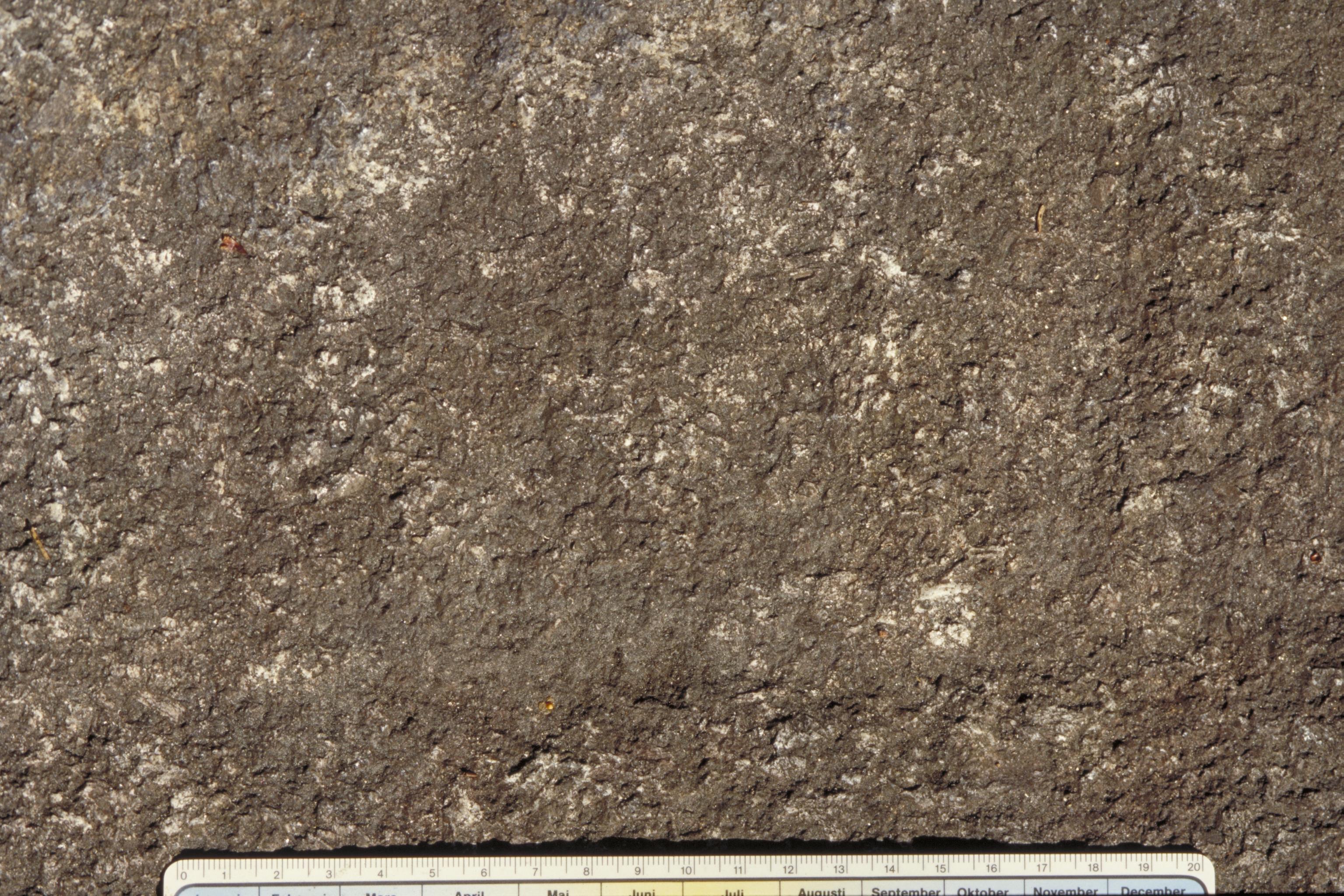 Vittrad stenyta med en linjal med månaderna, Askum 2:1.