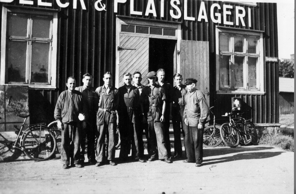 Skoglunds Bleck-och Plåtslageri vid Västgötagatan. Nr.2 fr.v. Gustav Skoglund, nr.3 Gösta Pettersson, nr.5 Gunnar Skoglund och längst t.h. plåtslagaremästare Alb. Skoglund på 1930-talet.