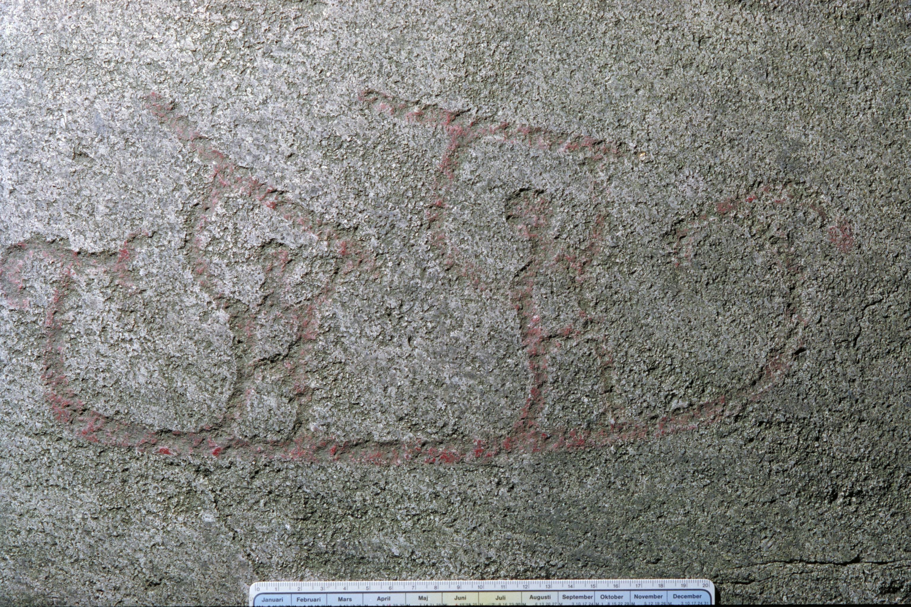 Skepp med människofigurer med höjda spjut. Tossene 73:1.