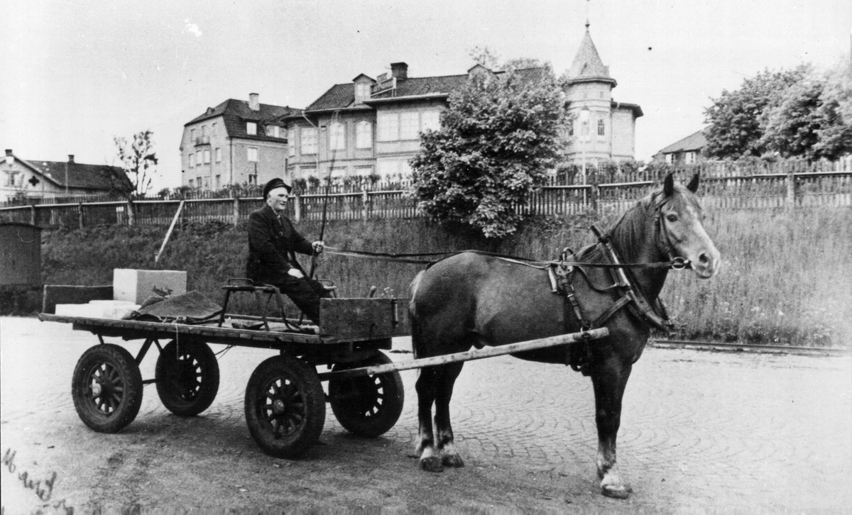 Karl-Erik Mårtensson heter "köraren". Fotot är taget på Borås Övre stations bangårdsområde med Olofsholmsgatan i bakgrunden på 1920-talet.