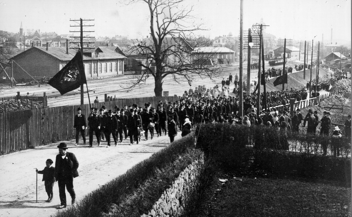 Demonstrationståget går upp på dåvarande Begslenagatan på väg mot Folkets Park, som då var nyanlagd vid en 1:a Majdemonstration år 1908.
