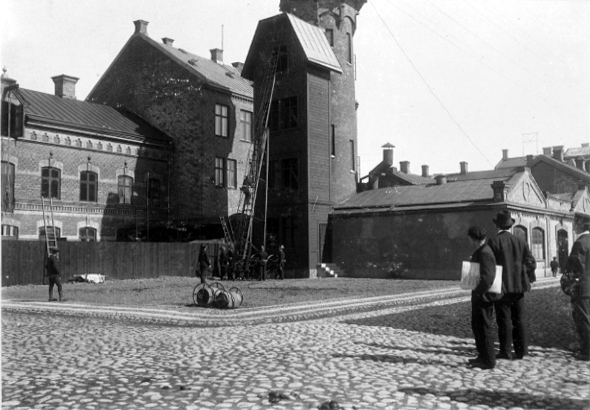 Hästdragen stegvagn vid brandstationen. Stegen är nu rest.