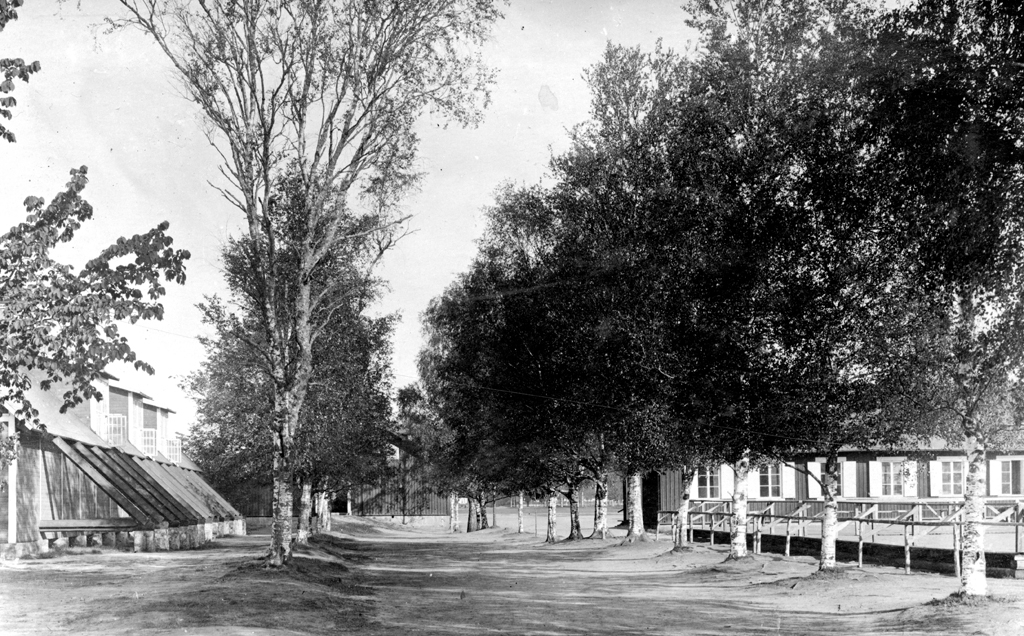 Kungliga Älvsborgs regemente på Fristad Hed, slutet av 1800-talet. Lägerhyddan vid stationen jämte dansbanan till höger.