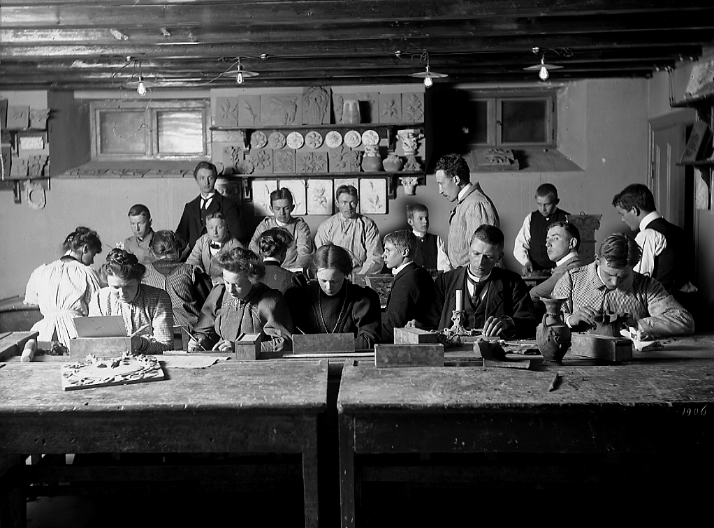 Tekniska skolan, modelleringen. Tveksamt om det fanns kvinnliga elever på Teknis 1906. Fotot troligtvis från en kvällskurs med läraren Hedaes (som väl var bildlärare på läroverket). Yrkesskolan bedrev undervisning i modellering.