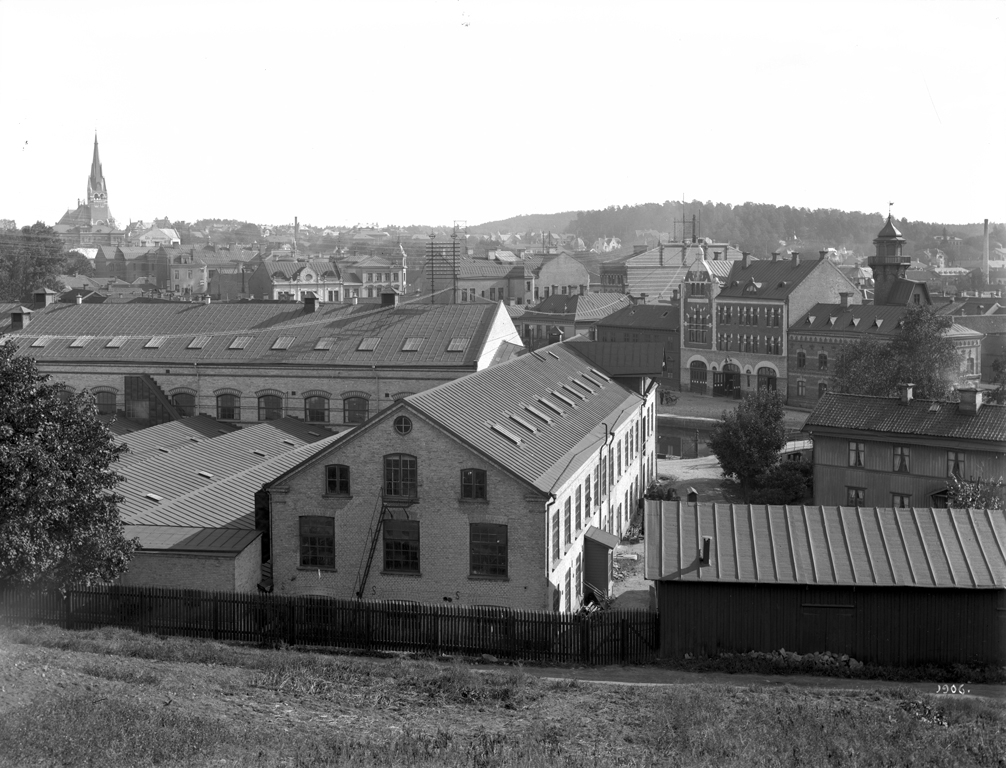 Bergengrens fabrik, vy från Krokshallsberget. Huset med tornet är den gamla brandstationen.