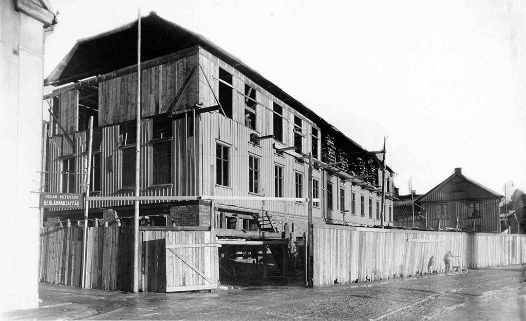 Kvarteret Pluto. Södra Strandgatan, Borås. Tillbyggnaden på dr Charles hus på 1920-talet. Stora Kyrkogatan går in till höger i bilden. Dåvarande Torpagatan.