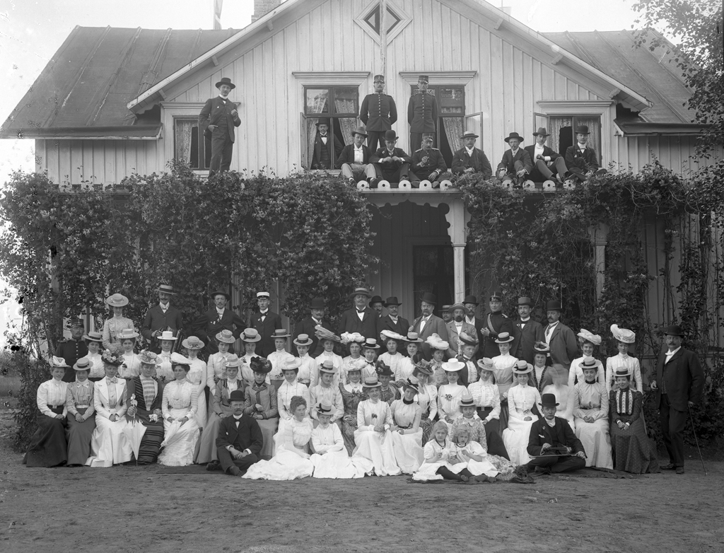 Soarésällskapet på utflykt till Långesten. Strax intill Öresjös södra strand vid Långesten byggde Sofie Lundin detta hus för sin serveringsrörelse. Sofie och hennes dotter Lovisa hade startat servering i blygsam skala i en liten stuga intill denna nybyggnad. När Borås-Herrljunga Järnväg på 1890-talet ordnade en hållplats i närheten blev stället ett omtyckt utflyktsmål. Fotot visar ett uppklätt sällskap som tagit sig till Långesten en försommardag 1901. Kanske skulle man planera följande säsongs soaréer.
