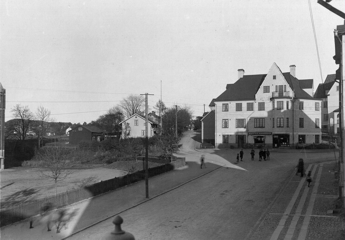 Brämhultsvägen österut från Åsbogatan med kvarteret Spoven i mellanplanet år 1922.