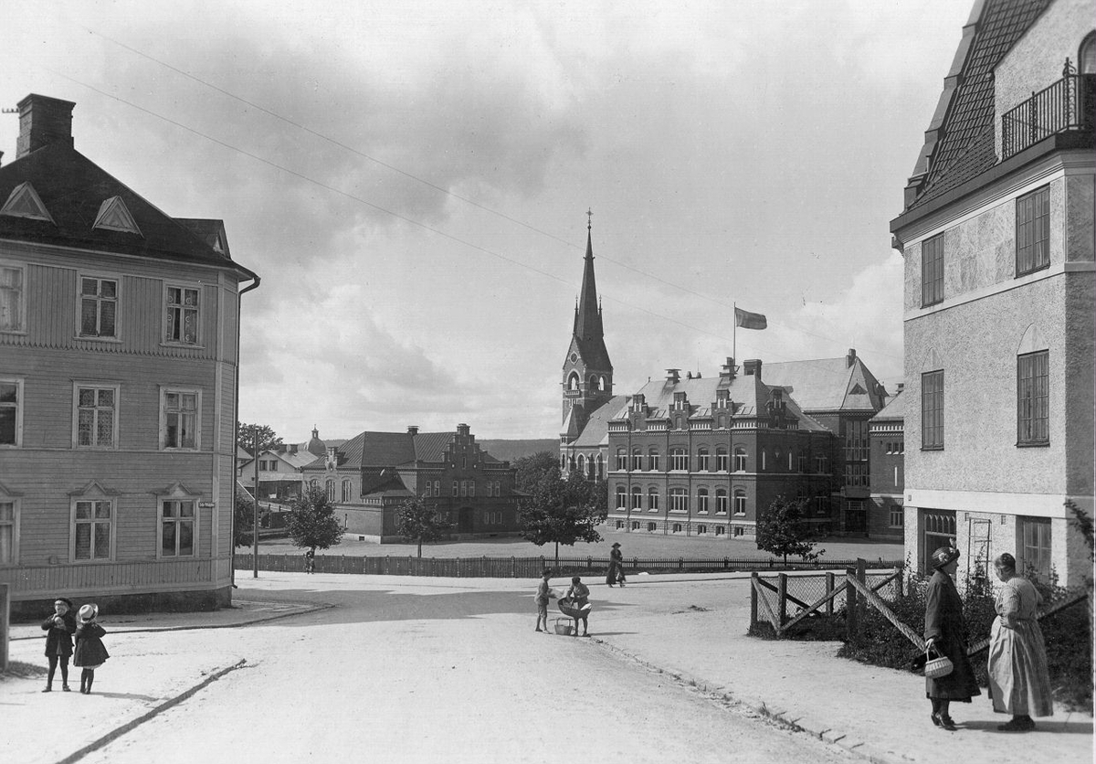 Åsbogatan västerut med Läroverket och kvarteret Ärlan t.v. år 1922.
