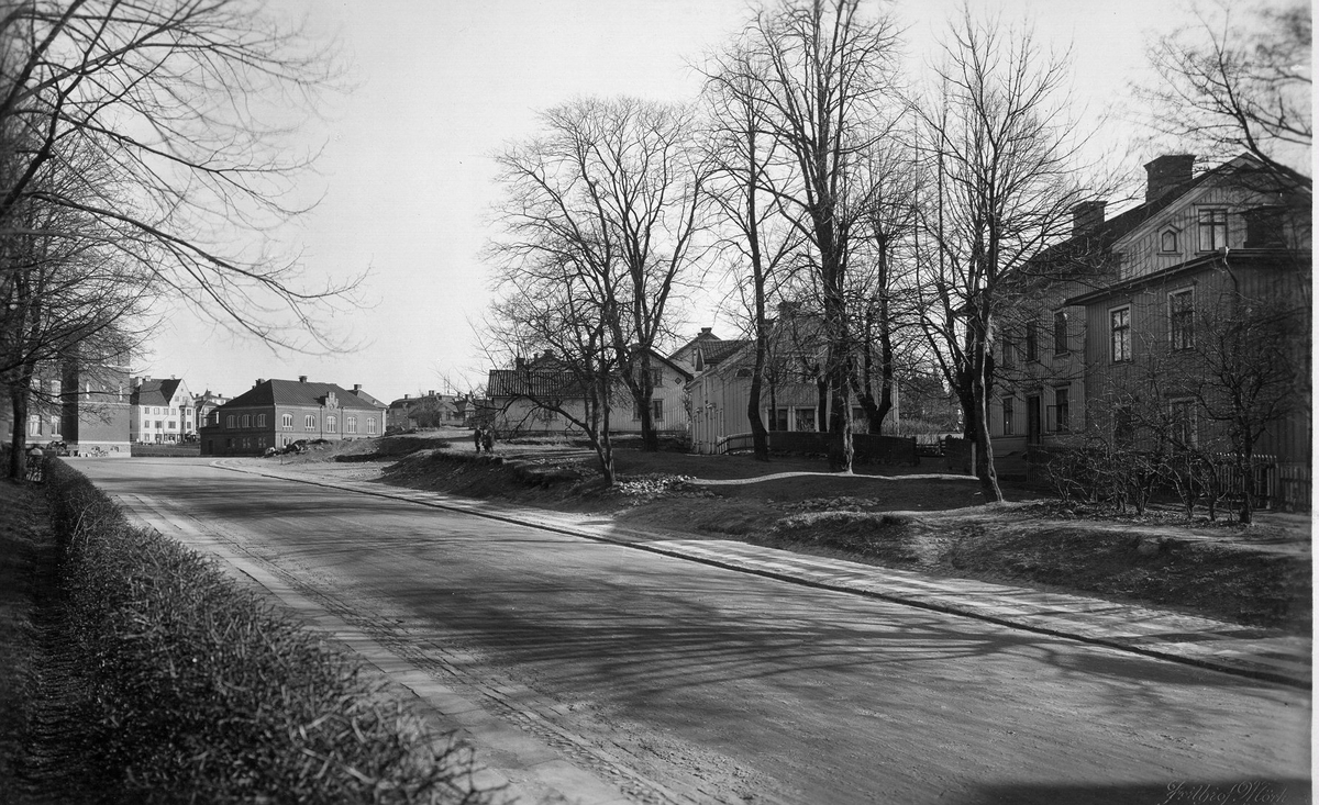 Läroverksgatan österut med kvarteret Sidensvansen t.h. år 1928. Här finns idag P.A. Halls terrass.