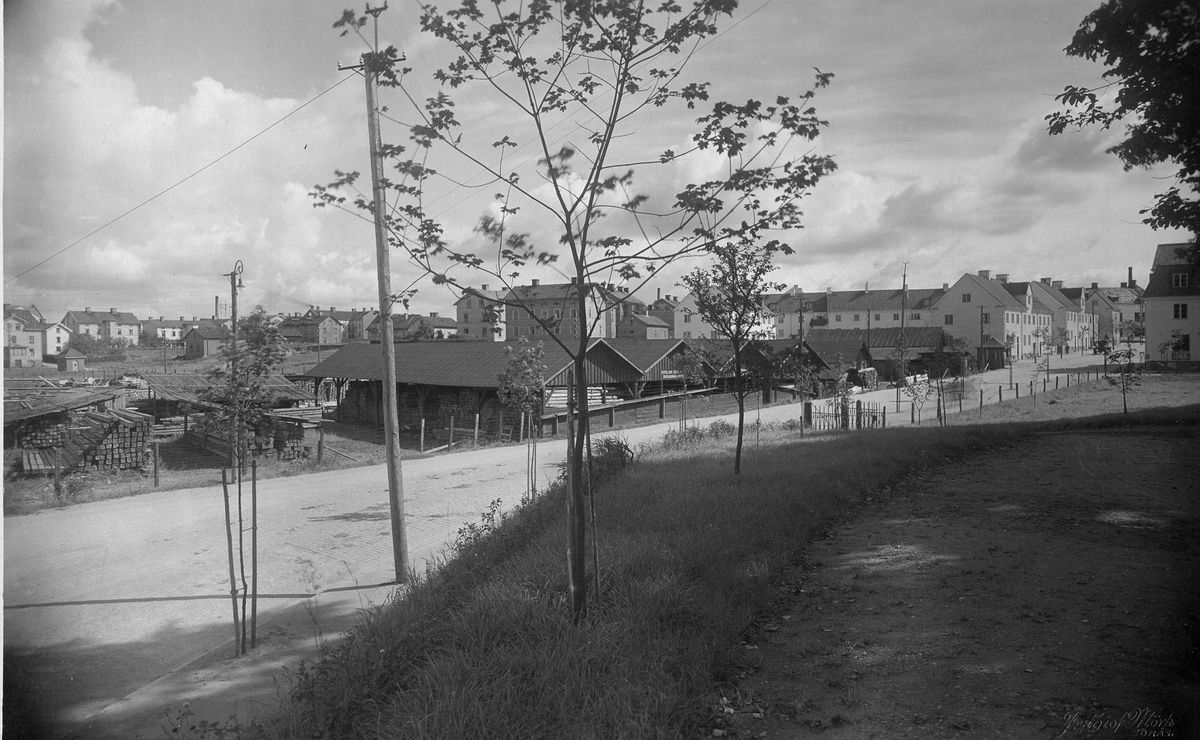 Byttorpsvägen (Alingsåsvägen) mot öster med kvarteret Timmermannen i mellanplanet t.h. år 1925.