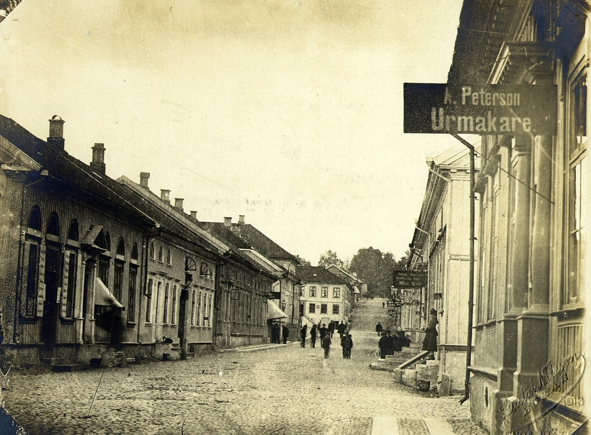 Stora Brogatan på 1880-talet med urmakare Peterson t.h.