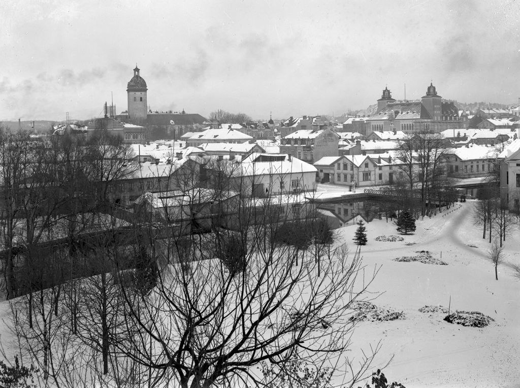 Stadsparken. Vy över centrum med Carolikyrkan och Rådhuset.