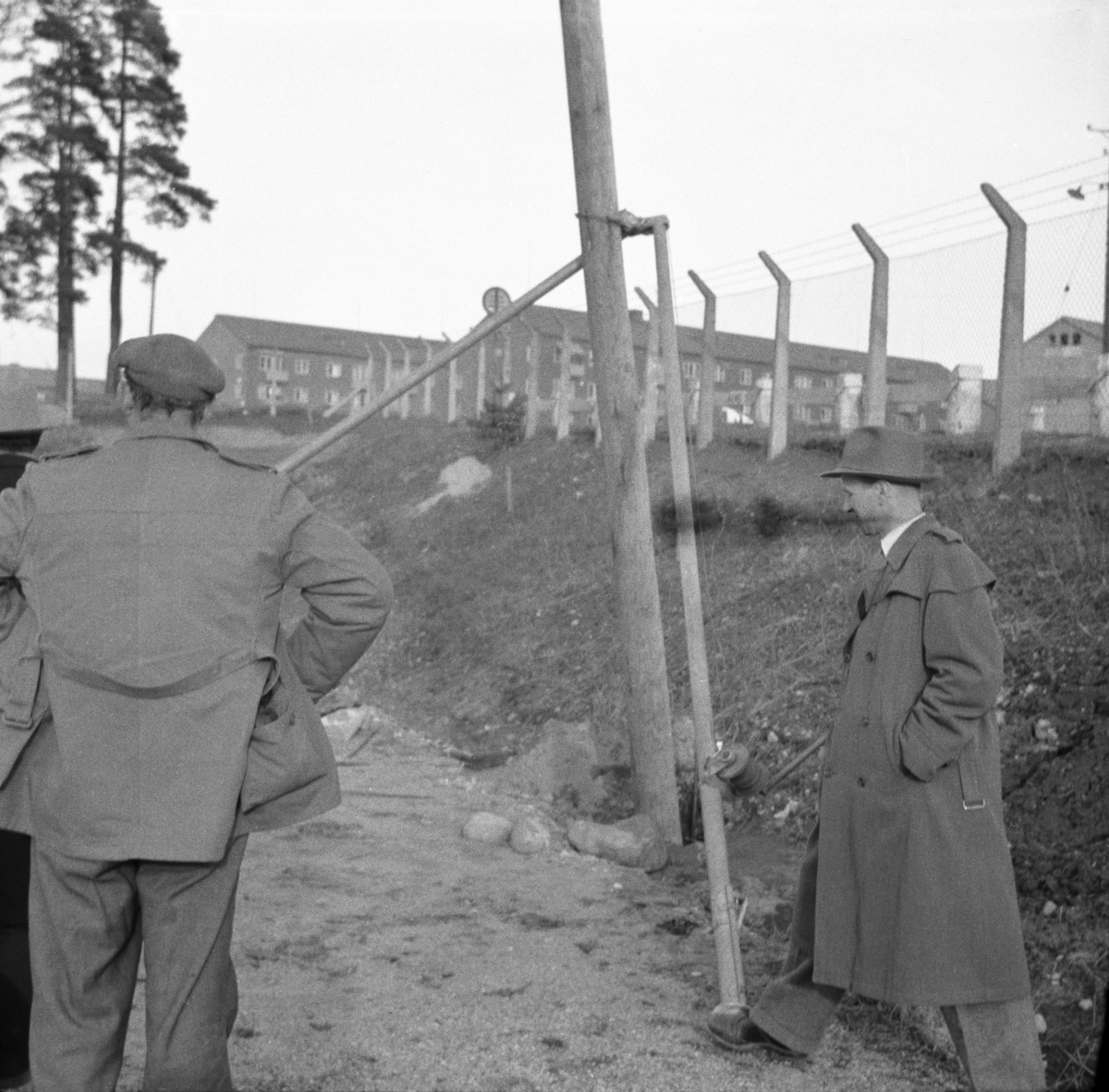 Titel: Bild tagen vid Varbergsvägen, Göta. Ett sällskap betraktar resningen av en stolpe med en sk. sparreholmsax.