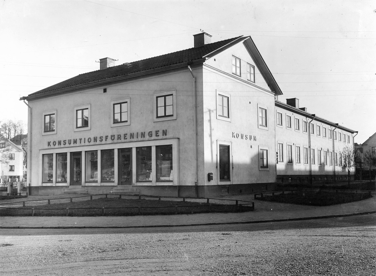 Konsumtionsföreningens egen fastighet vid Vennerbergsplatsen inrymmande speceri- och charkuteributik, charkuterifabrik, centrallager och kontor.