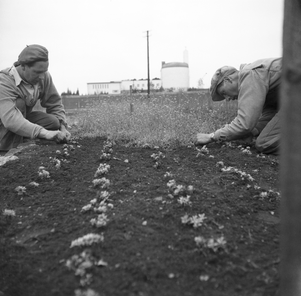 Två trädgårdsmästare sköter om växter i en rabatt vid S:t Sigfrids griftegård, krematoriet.