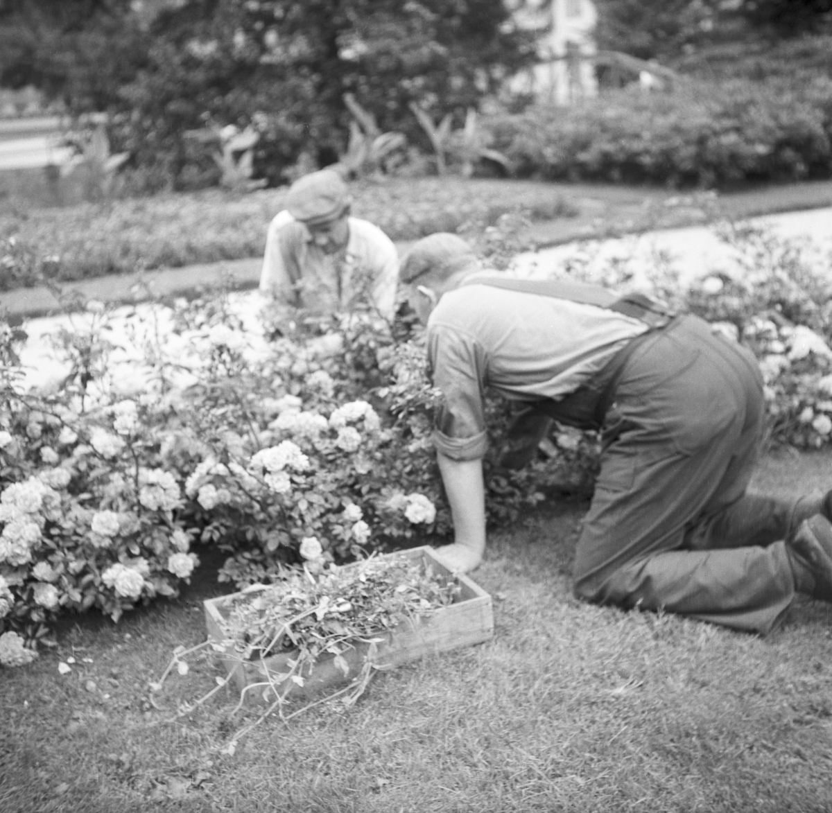 Två trädgårdsmästare rensar en rabatt med rosor.