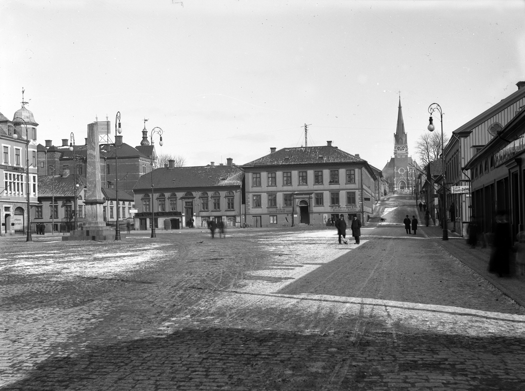 Stora Torget innan Rådhuset. Obelisken på torget. De två husen mitt i bild är till vänster Flaméns vinhandel och det högra är Rike Nelssons. Bilden är tagen ca. 1908.