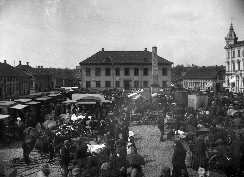 Stora Torget med torghandel. Mitt i bild det gamla Rådhuset.