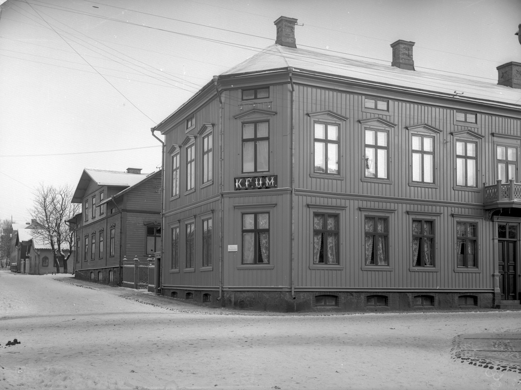 KFUM hus. Husets adress är Österlånggatan. Gatan till vänster är Kvarngatan.