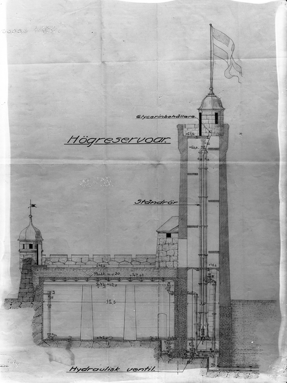 Vattentornet. Ritning genomskärning.