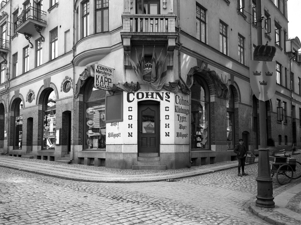 Cohns Manufaktur och Kappmagasin. Lilla Brännerigatan Österlånggatan. (von Ahns Huset).