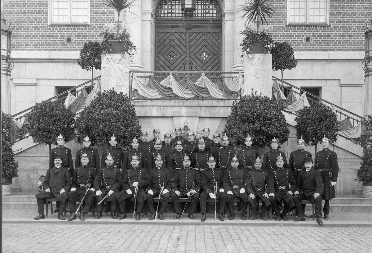 Polisen utanför rådhuset med jubileumsdekorationer år 1922. Enligt tysk modell ingick mustach och pickelhuva i utrustningen.