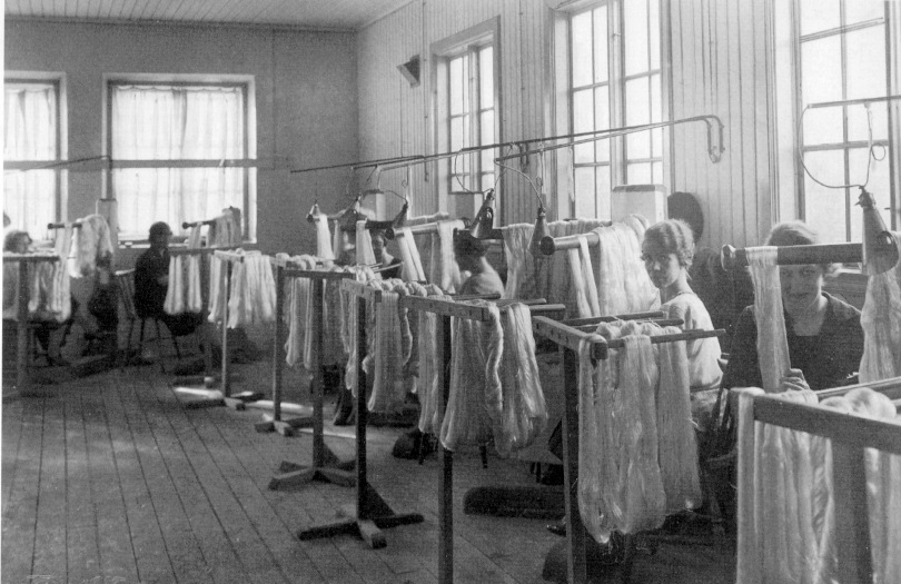 Interiör från Konstsilke omkring år 1920. På bilden pågår s.k. haspling av pasmor (härvor). Konstsilke startades år 1918.