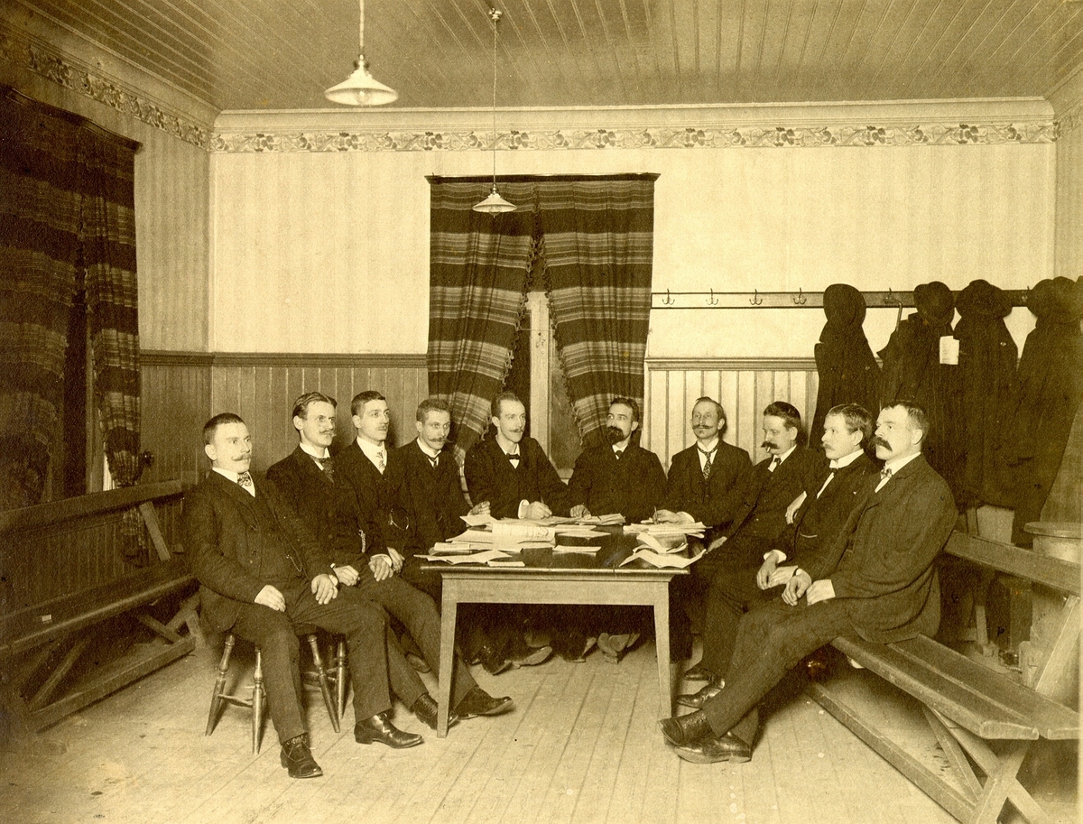 Vävlagarekonferens i Folkets hus lilla sal 7-8/12 år 1907. Nr. 4 fr.v Axel Winberg, nr. 5 Tobias Carlqvist nr. 6 Gustav Skog.