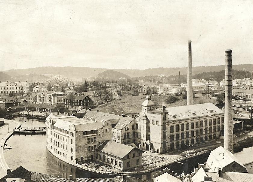 Wiskaholms fabrik i förgrunden med nybyggda svängda delen mot Viskan. Den låga svarta byggnaden på Krokshallstorget var "fattighuset". I den ljusa byggnaden där bakom bodde fotografen Gustaf Nilsson.