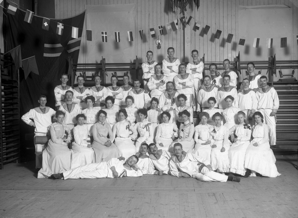 Idrottsgrupp från KFUM fotograferade i det gamla gymnastikhuset vid Carolikyrkan.