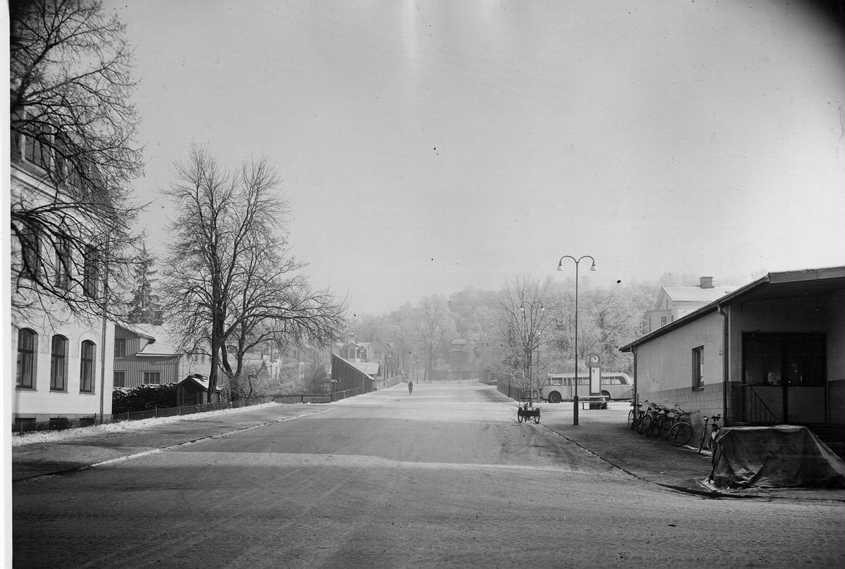 Fabriksgatan med gamla fjärrbussstationen t.h. år 1945 och med Siriusskolan t.v.