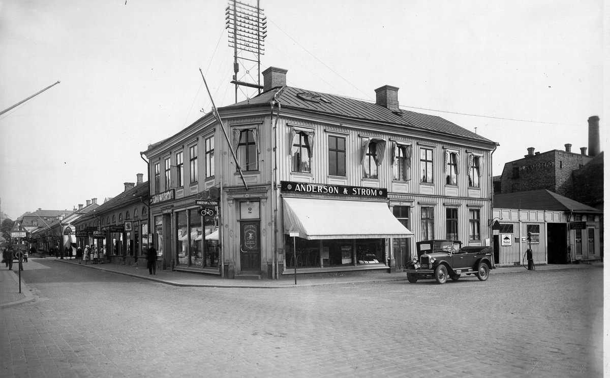 Stora Brogatan från Västerbro med kvarteret Morpheus i mellanplanet och cyckelaffären Anderson & Ström år 1927.
