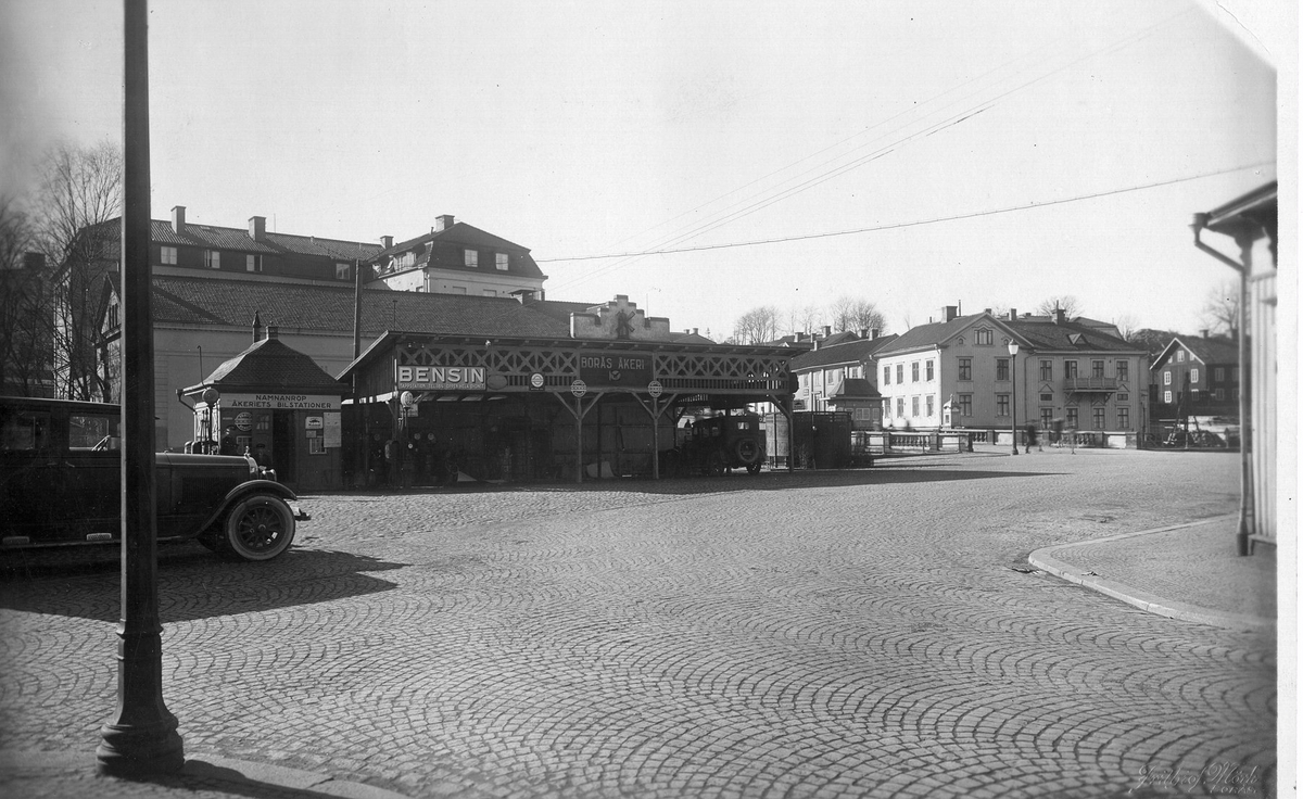 Fisktorget från mynningen av Lilla Brogatan år 1929 med Borås Åkeri.