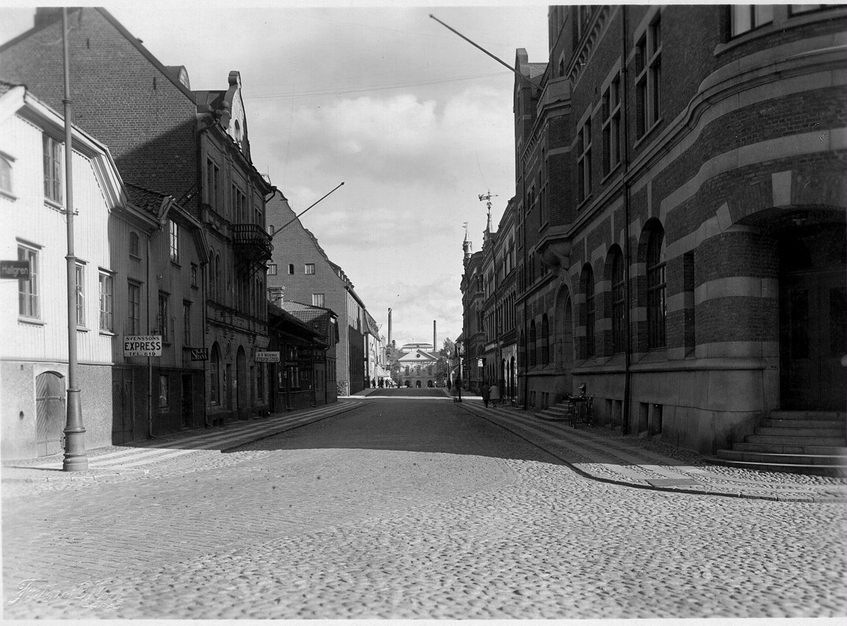 Västerlånggatan mot söder med åkeriet Svenssons Express (Svex) t.v. och kvarteret Galatea t.h. år 1926.