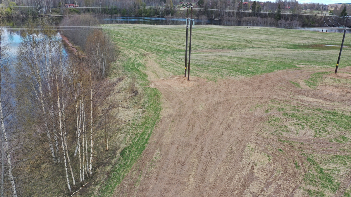 Översikt RAÄ Gagnef L2001:4137 med synliga spår efter arbetsfordon och schaktningsarbete för de nya stolparna. S
