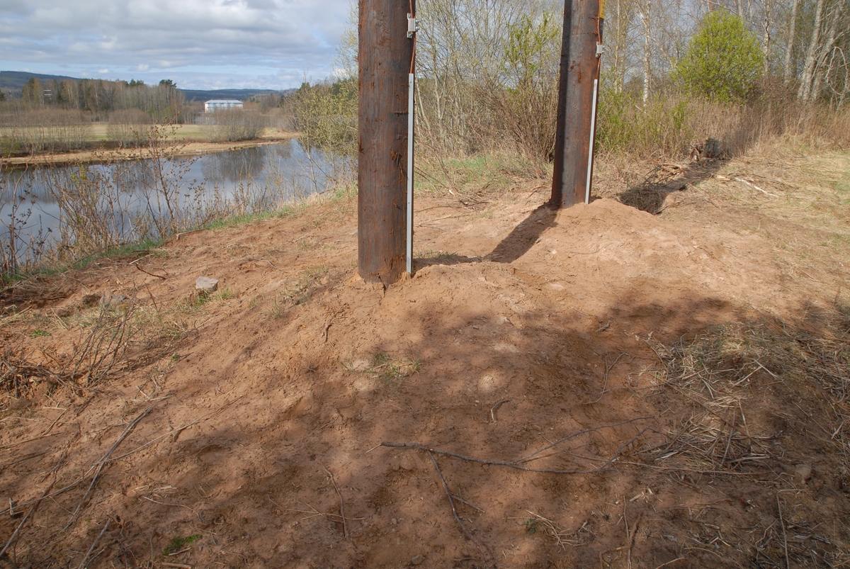 Detalj över RAÄ Leksand L2001:9869 med synliga spår efter arbetsfordon och schaktningsarbete för de nya stolparna. Från Ö