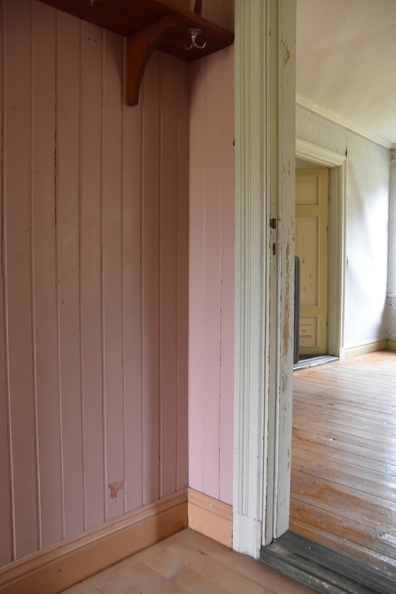 Titel: Interiör från korsplanshuset på Nygårdsgården i Bingsjö. Hallen på bottenvåningen med tillhörande trappor till källare och övervåning. Huset uppfördes 1912.