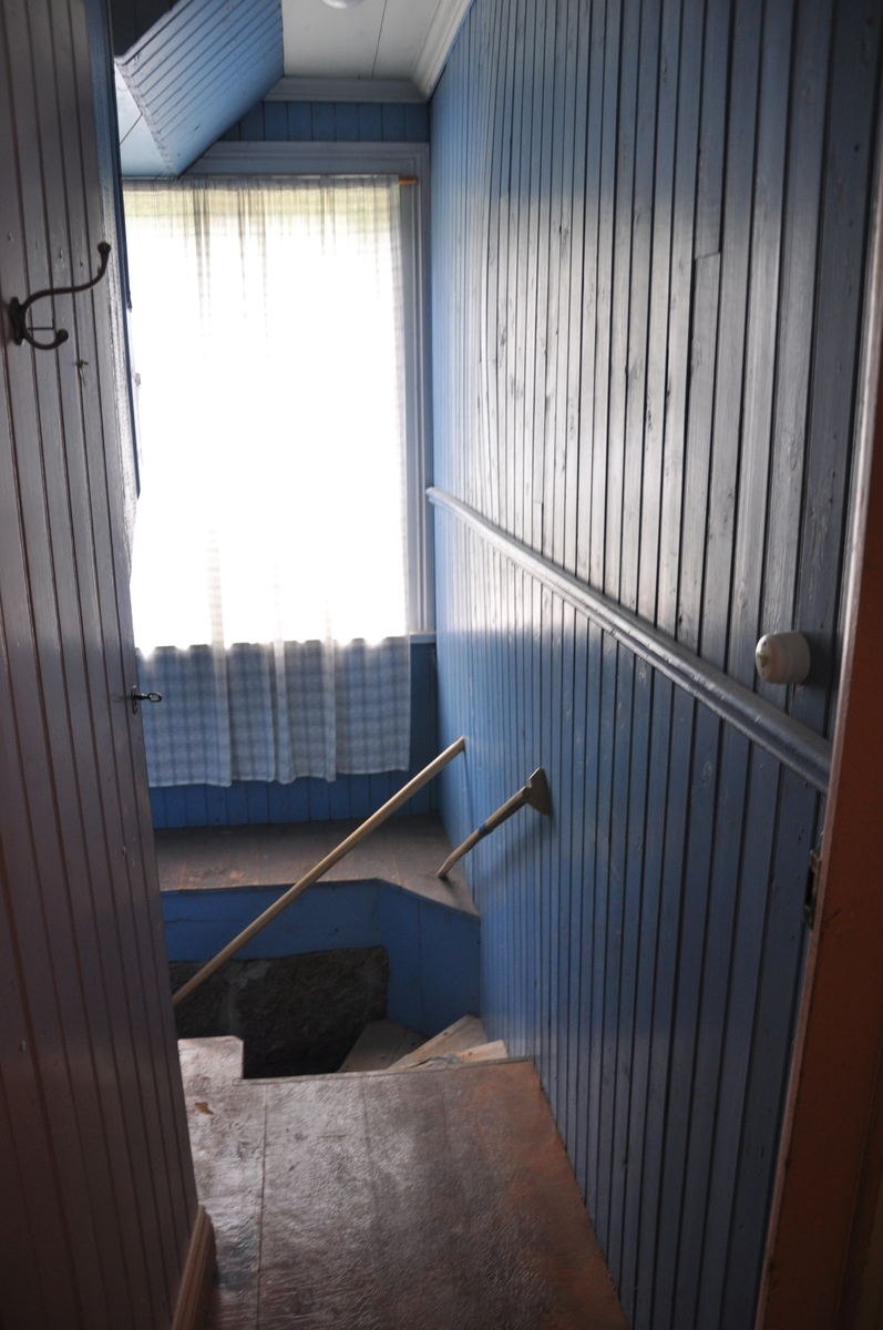 Titel: Interiör från korsplanshuset på Nygårdsgården i Bingsjö. Hallen på bottenvåningen med tillhörande trappor till källare och övervåning. Huset uppfördes 1912.