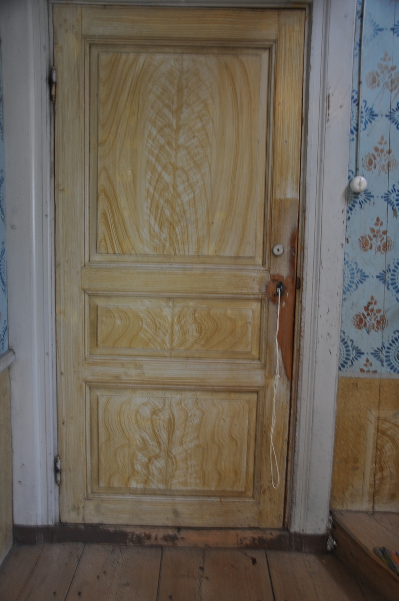 Interiör från förstugan i parstugan på Nygårdsgården i Bingsjö. Byggnaden stod ursprungligen på annan plats i byn men flyttades omkring 1860–1861 till nuvarande plats som då var åkermark. Bakom denna dörr fanns under en tid byns postkontor.