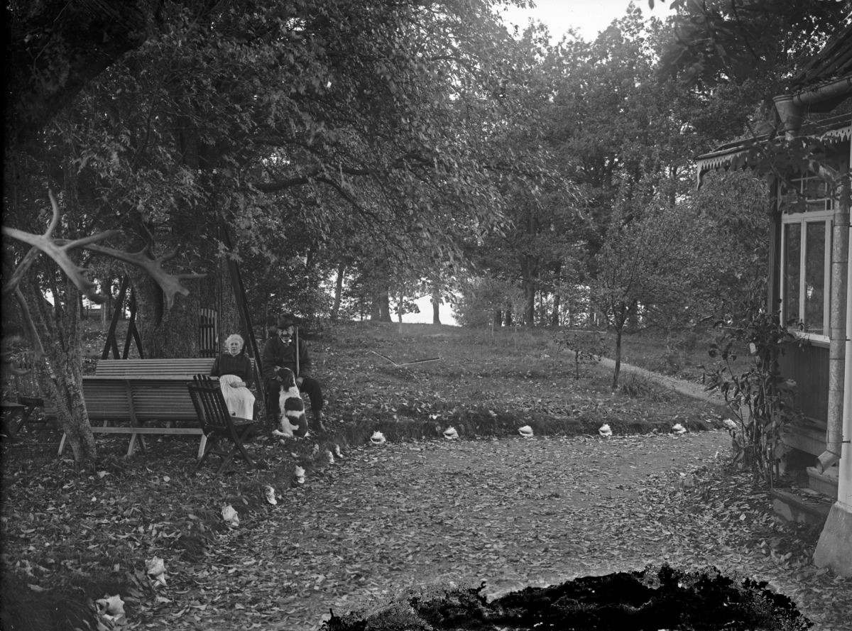 Man, kvinna och hund utanför hus, Stora Stämsvik, Övergrans socken, Uppland. Modern adress Målarvägen 10, Bålsta.