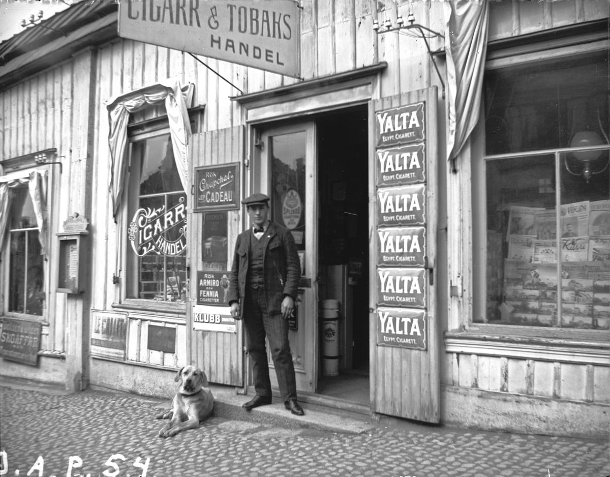 Enköpings Cigarr- & Tobakshandel, Kungsgatan 16, Enköping. Skyltskåpet i vänster bildkant är märkt Folkets Parks Affischtafla.