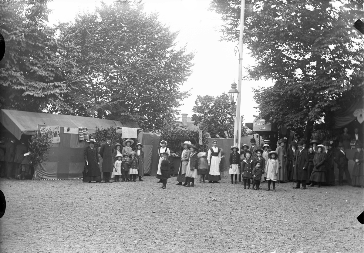 Basar? På skyltarna står från vänster: "Skjutbana", "Bokhandel. Köp", "Frukt", "Postkontor" samt troligen "Tombola".