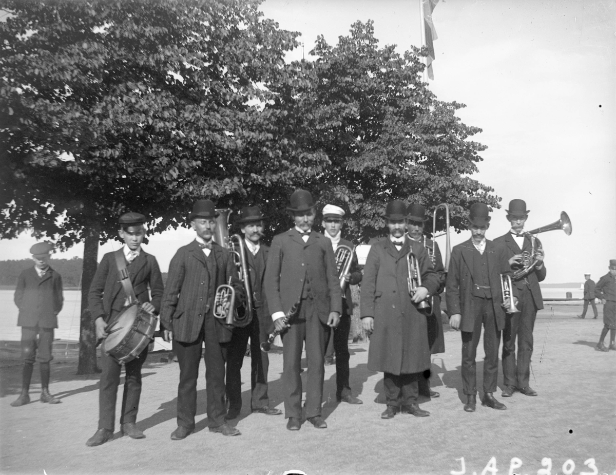 Musikkår, oidentifierad. Båtar och en sjövik i bakgrunden.