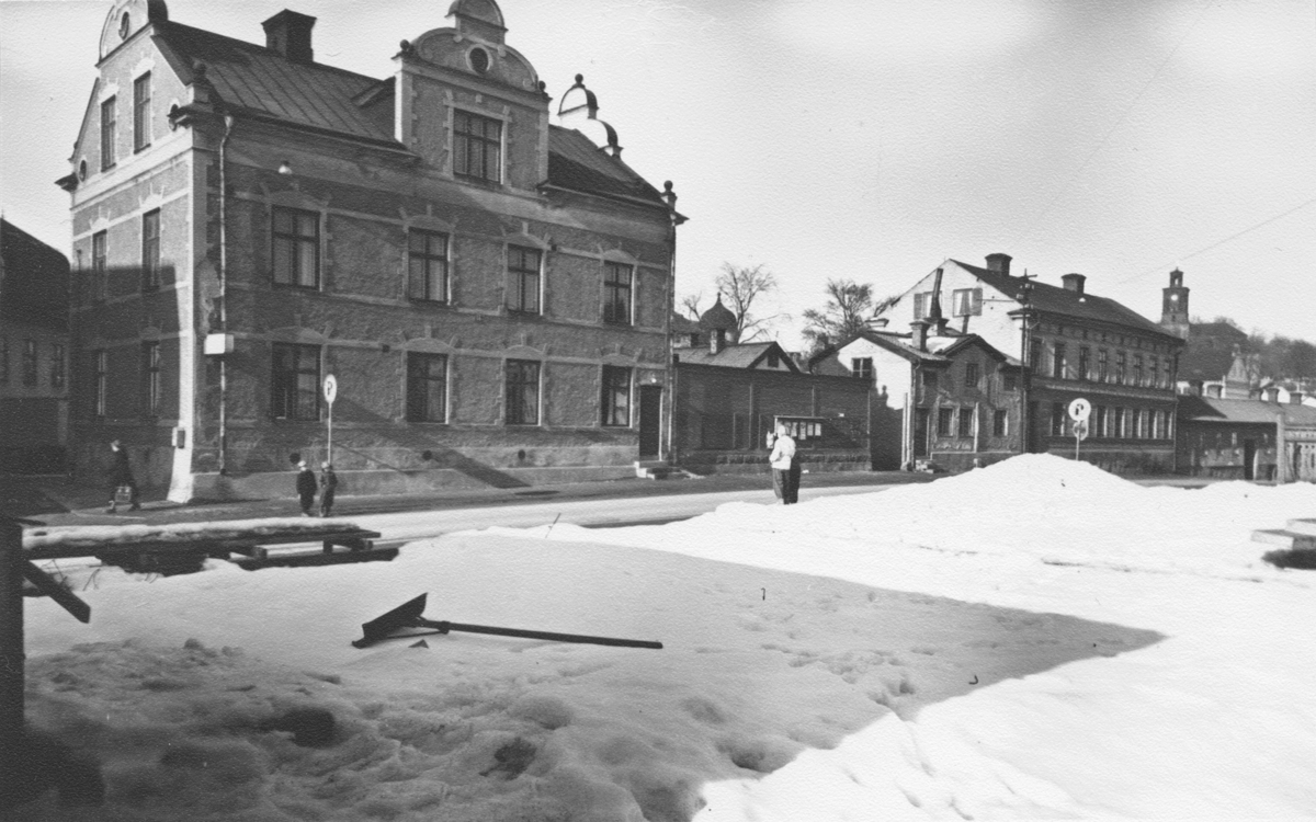 Kungsgatan 8-14, kvarteret Kaplanen 2-4 och Borgmästaren 1, Enköping, sett från söder, december 1954