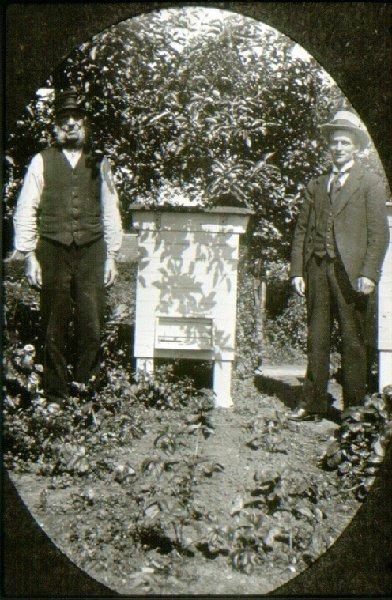 Kv. Snickaren. Repsalagargatan 33 - Ambjörnsgatan 2. Trädgårdsmästare John Johansson och hans styvfar skräddare Larsson vid bikupa utanför Drick- Augusts stuga.