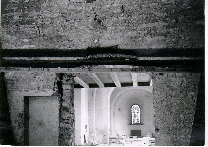 S:t Olofs kyrka. Restaureringen 1958-1961. Tornet. Västra långhusväggens nedre del, sedd fr. vapenhuset.