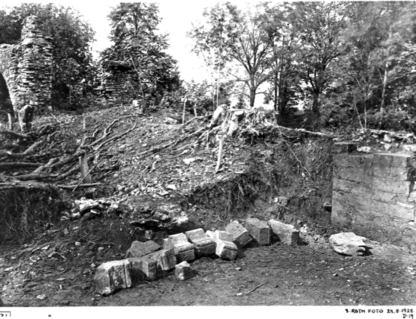 Tribunbågen. Mittkoret mot nordväst med nedrasade valvstenar i läge som de påträffades (ovanför stenarna 101-84 en nedrasad murklump.)
