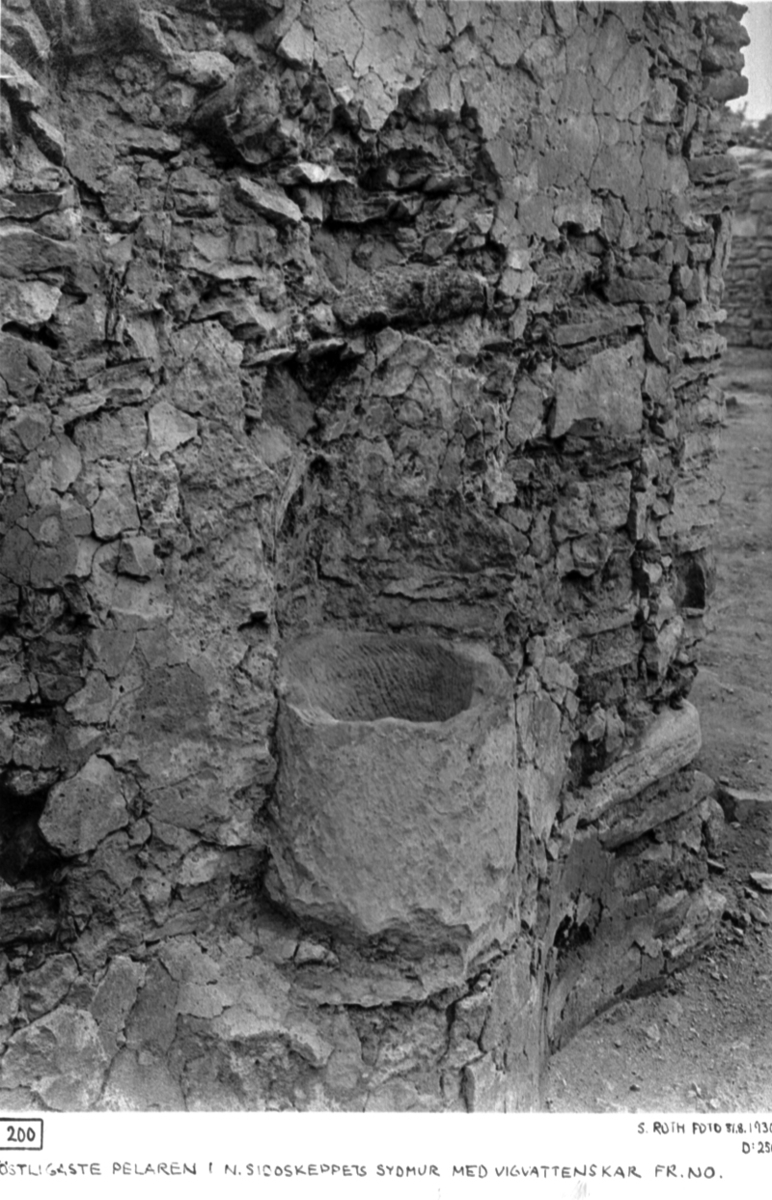 Östligaste pelaren i norra sidoskeppets sydmur med vigvattenskar från nordost.