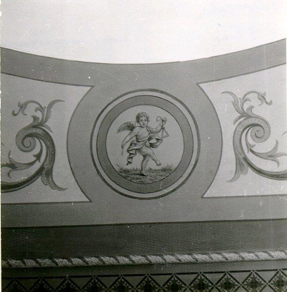 Kv. Guldsmeden. Storgatan 18, Per Lars tomt. Den "Janssonska" fastigheten före rivningen 1957. Stora salen 1 tr. upp i huvudbyggnaden. Detalj av takmålning. Lär vara målad på 1890-talet av Svante Haglund.
